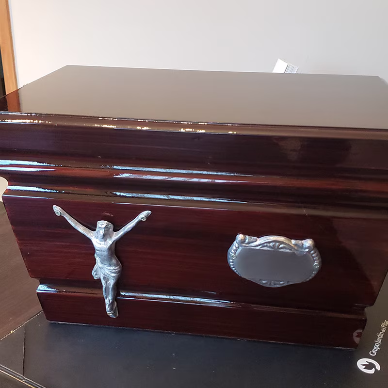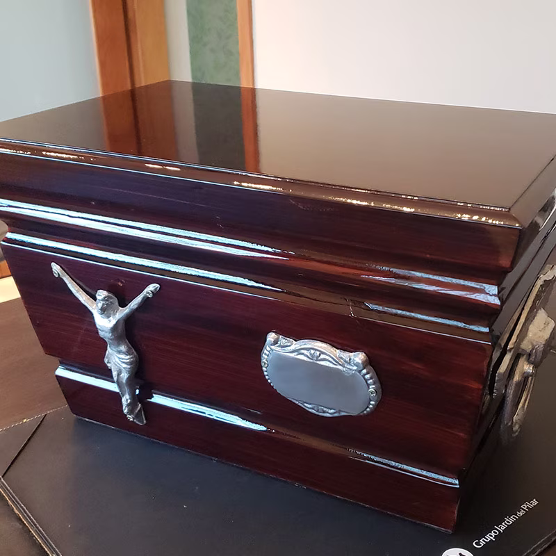 Urna para restos, tapa lisa, madera nacional tipo cedro, calor caoba.